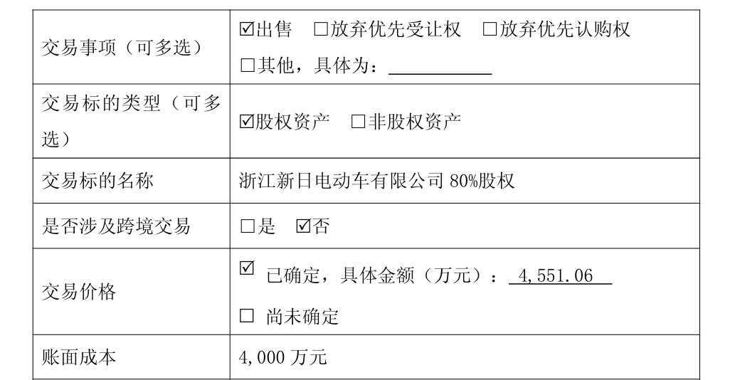 1月5日晚间,新日股份公告称,公司拟将全资子公司浙江新日电动车有限公司(以下简称“浙江新日”)80%股权转让给浙江鑫日新材料有限公司(以下简称“鑫日新材料”)。