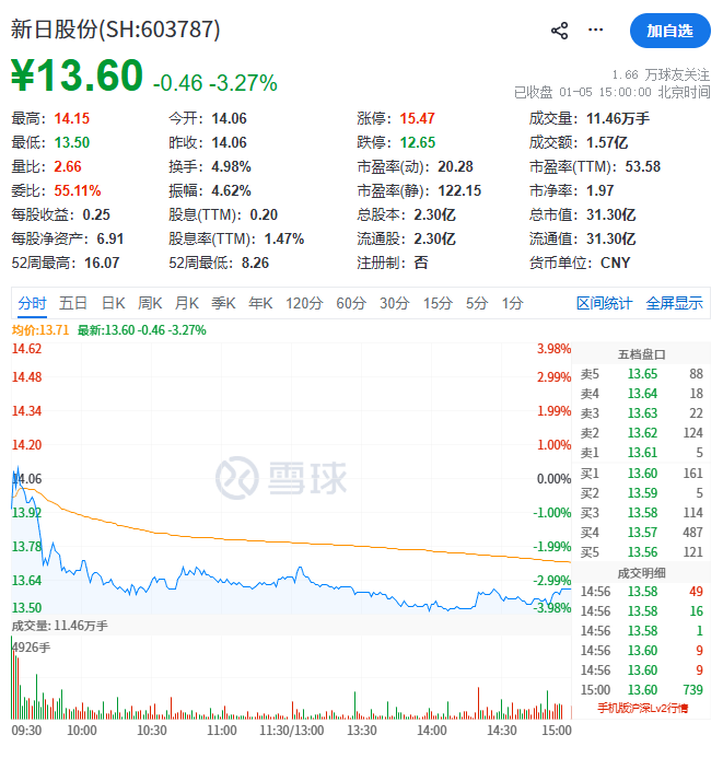 二级市场上,截至1月5日收盘,新日股份跌3.27%,报13.6元/股,总市值31.3亿元。